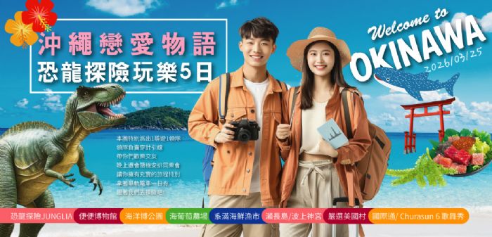 | 2026/3/25 | 沖繩戀愛物語~恐龍探險玩樂5天 | 5 天 | 男:39900元 女:36900元 | *早鳥價:12/20前報名並繳交訂金現金10000元.可再優惠900元. | ![]() |